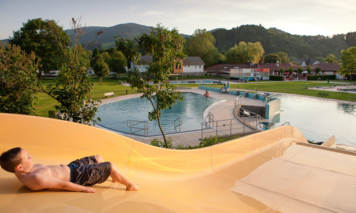 Das benachbarte Freibad ist wie vor der Pandemie für unsere Gäste uneingeschränkt nutzbar und im Übernachtungspreis inklusive. Allerdings gibt es Verzögerungen bei den Umbau- und Sanierungsarbeiten.